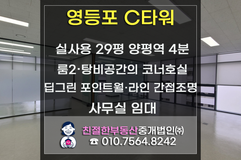 [영등포 C타워] 룸2+탕비+코너 구조, 실사용 29평 오피스가 갖춘 완벽한 3박자!|전면 연속창·동향 채광|딥그린 포인트월·라인 간접조명|양평역 초역세권·선유로/양평대로 인접